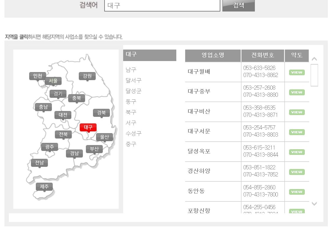저는 대구를 검색해봤는데, 대구비산, 대구서문, 달성옥포, 경산하양, 동안동등 대신화물 취급점이