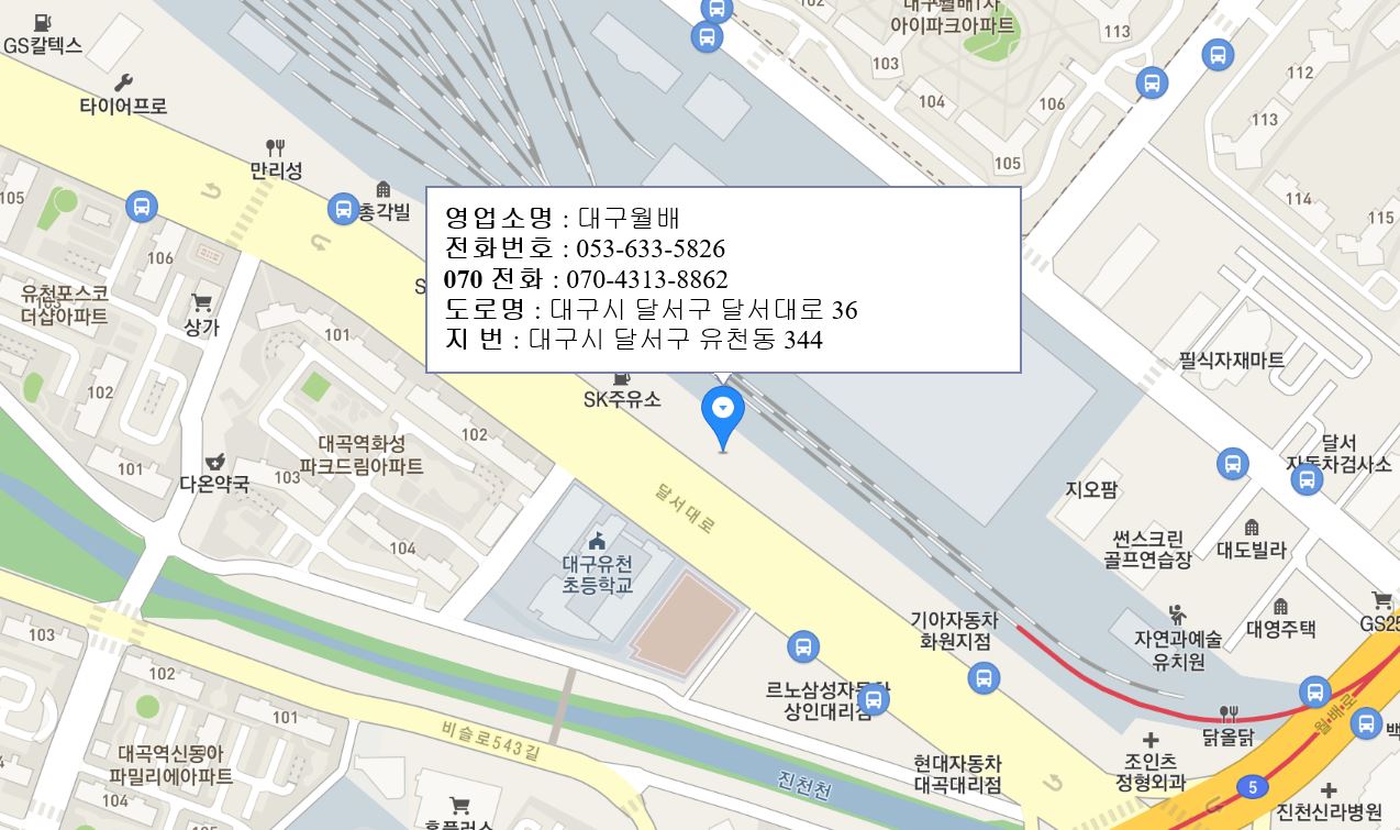 대구월배 약도를 클릭해보니 지도가 나타나면서 영업소명, 전화번호, 전화번호및, 주소가