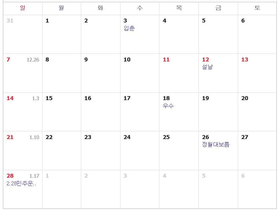 21년 2월 달력인데, 보시면 한눈에 쉬는 날이 들어 오죠
