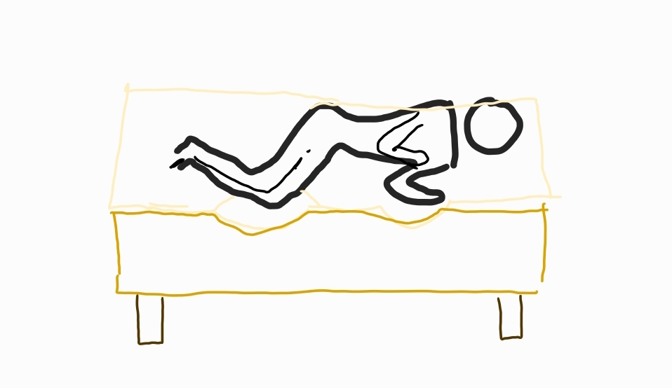 2. 고개를 오른쪽으로 45도 돌린 채 빠른 속도로 왼쪽으로 쓰러지듯이 누워 30초간 유지합니다.