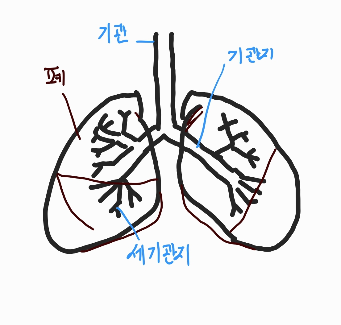 코로 들어와서 인두, 후두, 기관, 기관지를 거쳐서 폐포에 도달하게 됩니다.
