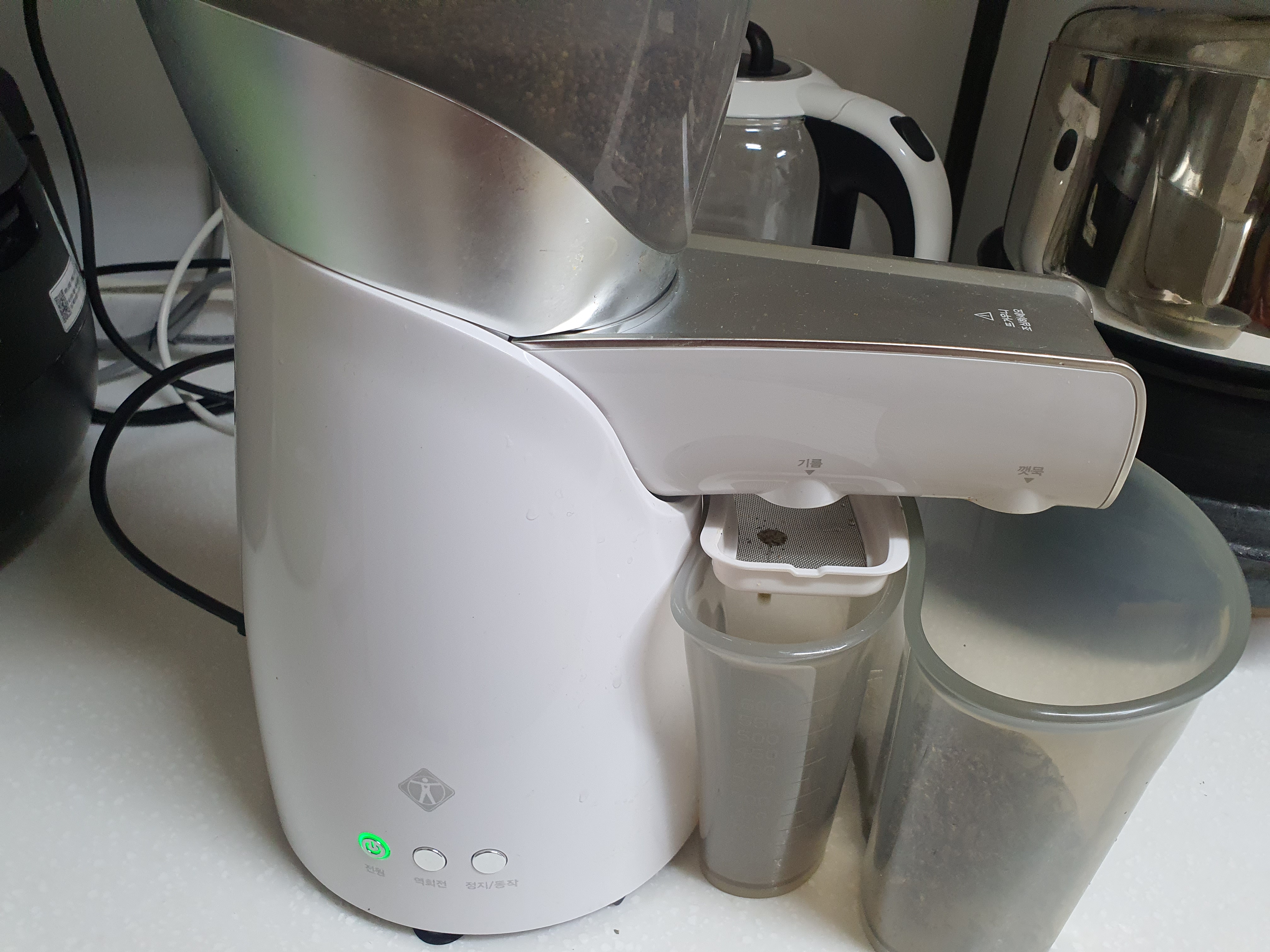 가정용 착유기에 들깨를 넣고 뚜껑을 덮고 버튼을 누르면 자동으로 기름이 짜 진답니다.