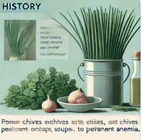 차이브는 B.C. 3000년경 중국에서도 사용된 기록이 있습니다. 중국의 식물지에서는 차이브를 북총 또는 호산이라 불렀으며, 외국의 파라고 소개되어 있습니다. 차이브는 중국에서도 요리에 널리 사용되었으며, 그 항균 및 방부 효과가 주목받았습니다.
